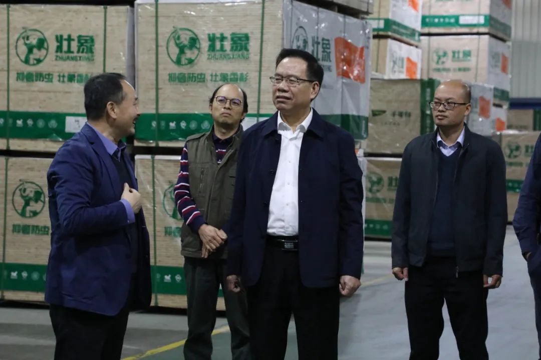 图三、图四:督查组在广西壮象木业有限责任公司,在了解融安县香杉产品研发生产和品牌建设情况。